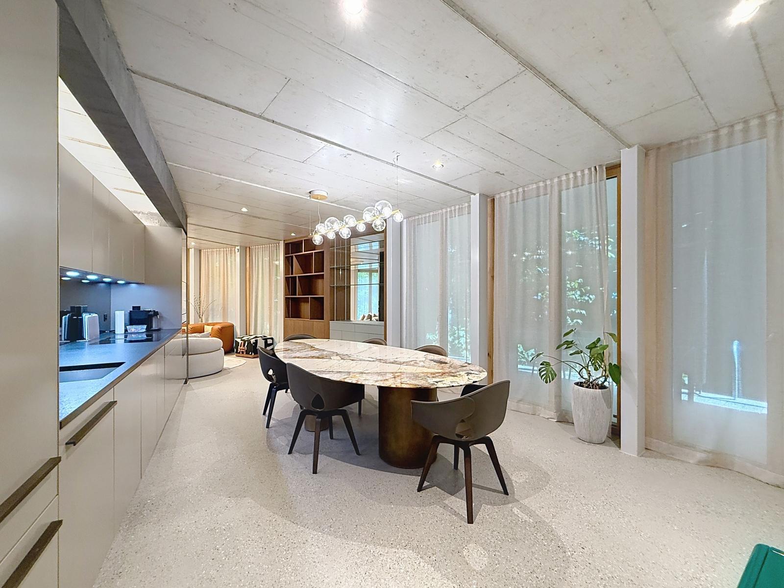 This property benefits from high-end finishes, such as large bay windows allowing natural light in and offering a magnificent view to the outside, electric blinds, different lighting moods, custom-made tall wardrobes, polished concrete, underfloor heating, wine cellar, private laundry room.