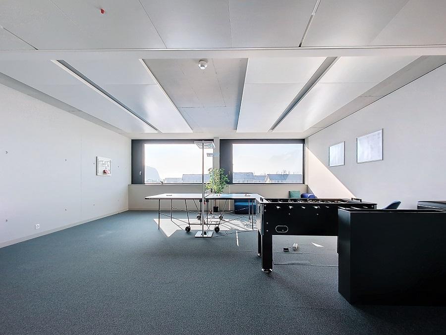 A cafeteria located on the landing, available to tenants, encouraging informal exchanges and creating a friendly working environment.